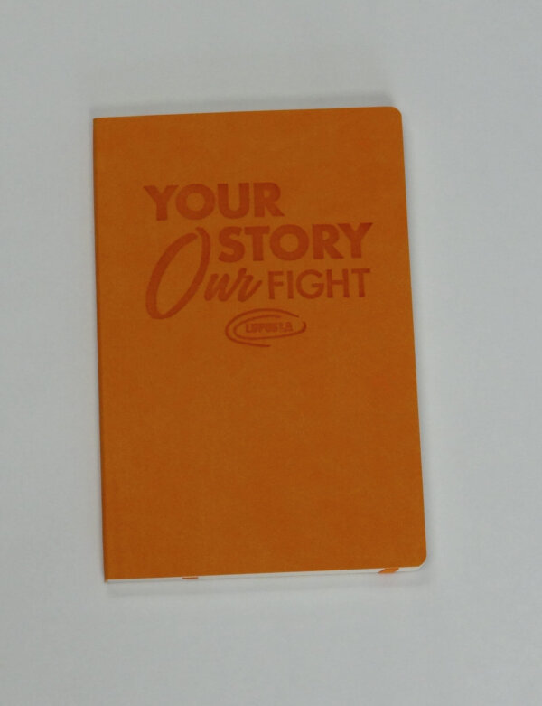 Pedova journal book. Features built-in elastic enclosure, ribbon page marker, document pocket on back cover and 80 sheets of cream lined paper. Debossed with “Your Story Our Fight and Lupus LA” logos on the cover. Journal size is 5.5” x 8”.
